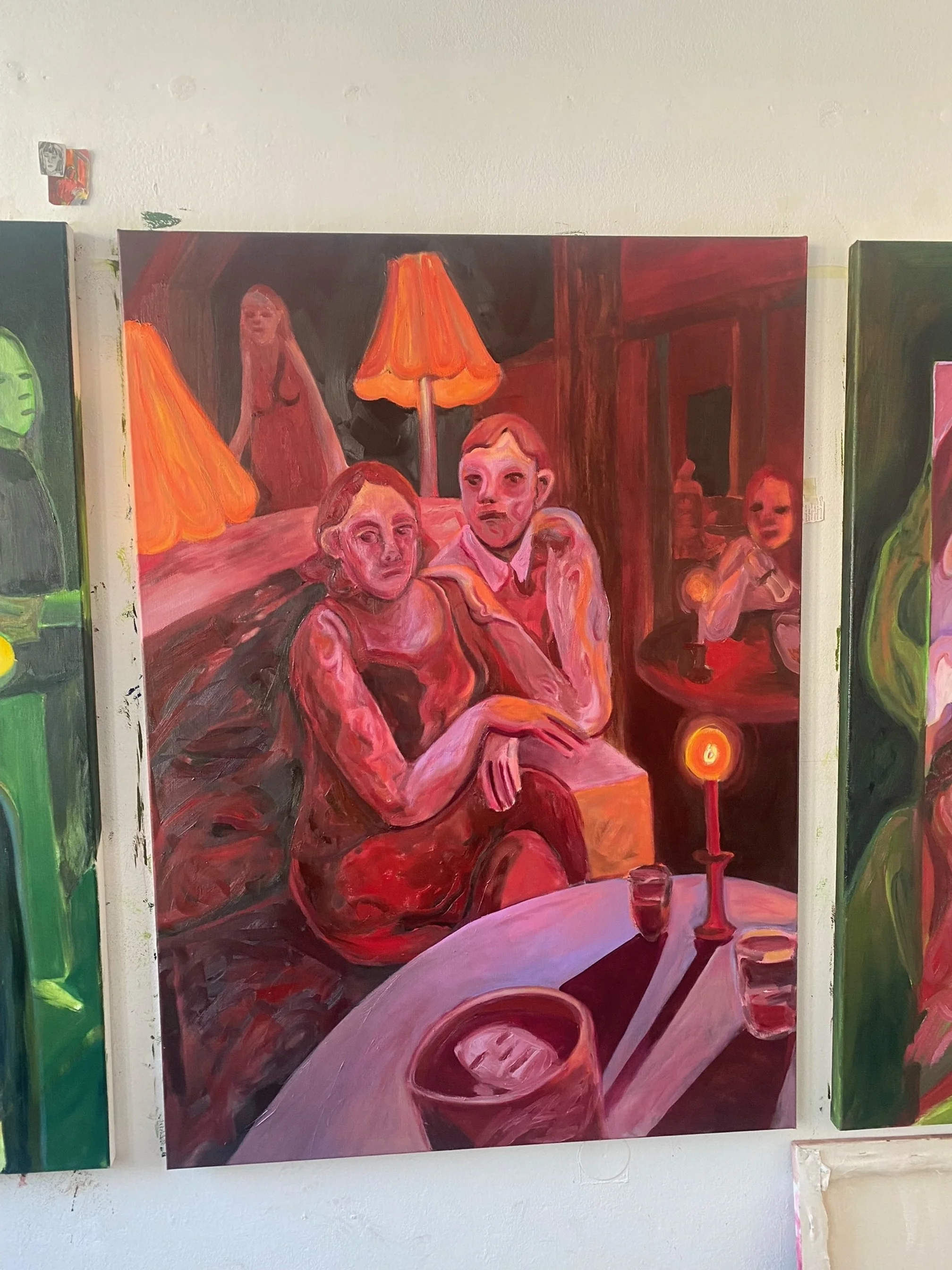 The artworks follow a protagonist navigating a fictional social event, with each painting capturing a different perspective at a distinct moment in the evening. The works explore feelings of social anxiety and pressures of social expectations. Most of the paintings are presented from a first-person perspective, immersing the viewer in the protagonist's experience. The animation portrays the protagonist becoming overwhelmed and taking a moment of privacy to recenter, it offers a glimpse into the private, and more vulnerable experience behind the social façade.